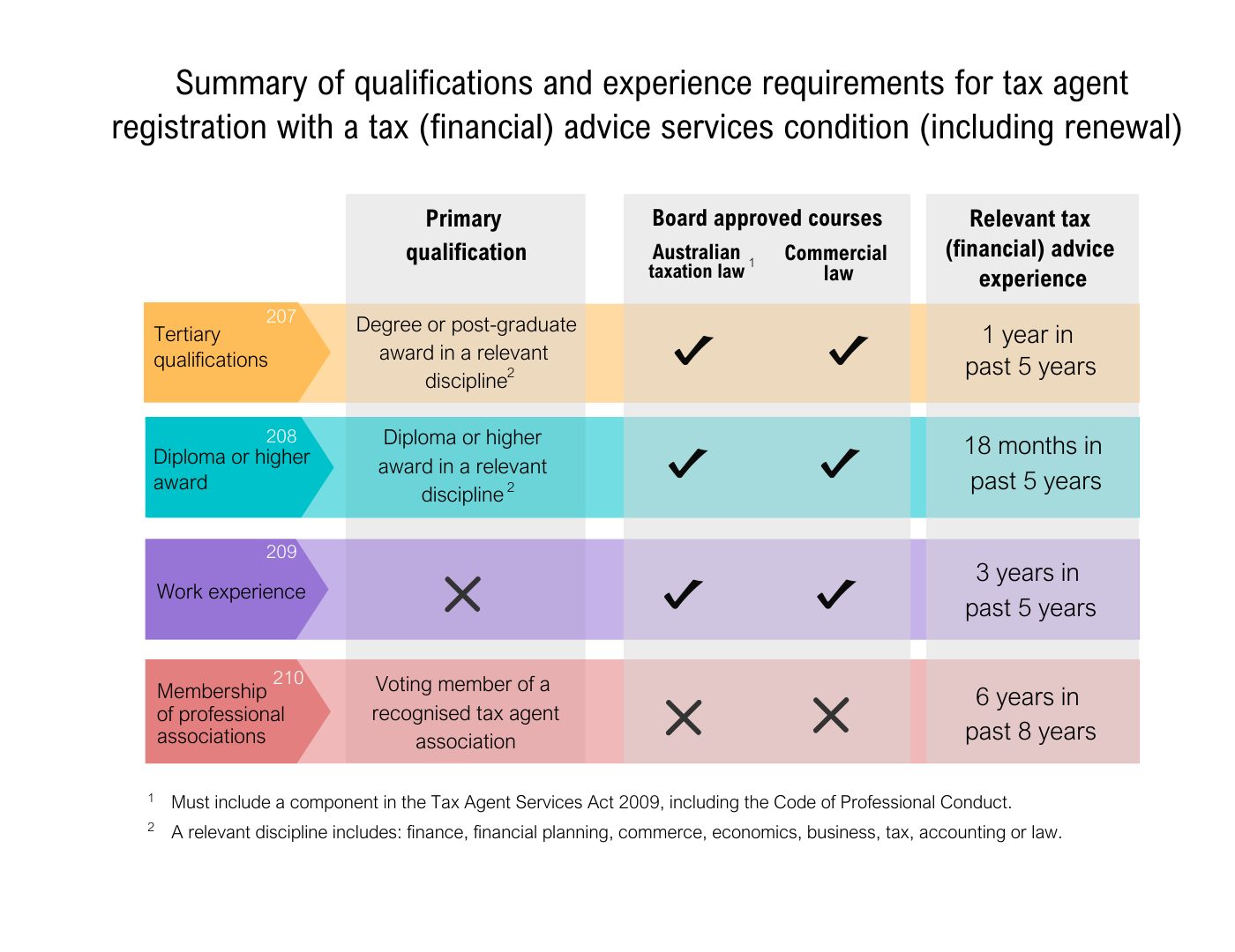 - Summary of qualifications and experience requirements for financial services licensees and their representatives to register as a tax agent